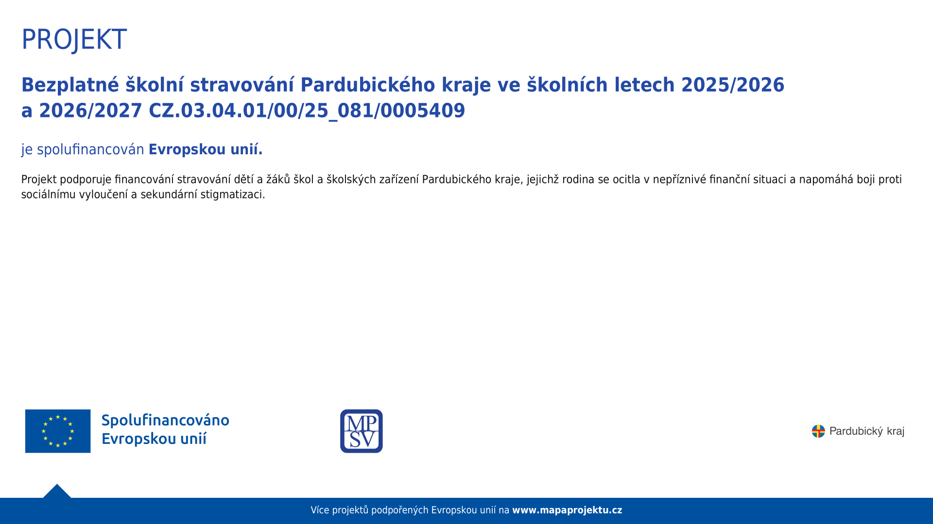 Tento projekt je realizován v rámci výzvy č. 03_25_081 Potravinová pomoc dětem v sociální nouzi (2) v Operačním programu Zaměstnanost plus vyhlašovaný MPSV. Bezplatné školní stravování se zaměřuje na zajištění dostupnosti školního stravování pro děti a žáky ve věku 2–26 let v Pardubickém kraji, kteří pocházejí ze sociálně a ekonomicky znevýhodněných rodin.
